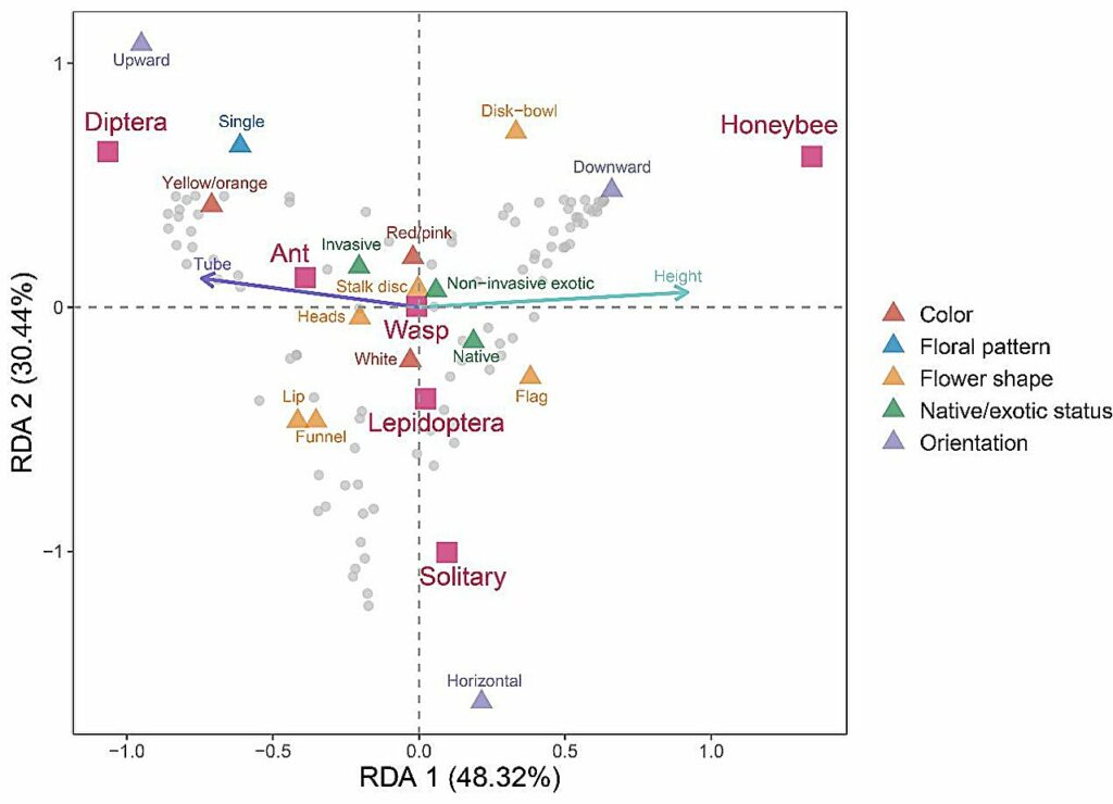 Resultaten visade att blommans form, öppningsriktning och färg signifikant påverkade pollinatörers val av blomma. Fjärilar föredrog tratt- och huvudformade blommor; tvåvingar föredrog uppåtvända gula och orange huvudformade blommor. Bin favoriserade tvååriga och fleråriga örtartade växter med skål- och flaggformade blommor. Solitära bin visade en preferens för horisontellt öppnade läpp- eller flaggformade blommor.