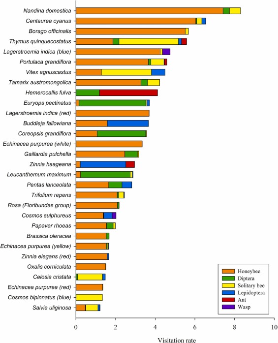 Besöksfrekvens (genomsnittligt antal besök som varje blomma fått per timme) och andelen pollinatörgrupper med de 30 mest attraktiva växtarter. Bild: Wang Hui