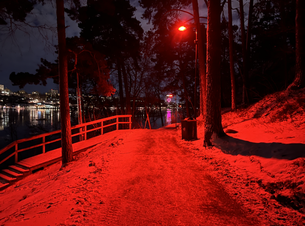 Bilden visar den nya belysningen vid Årstaviken i Stockholm. Foto: C/O City