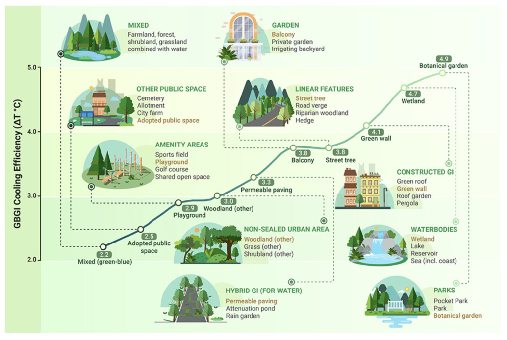 Forskarna framhåller att det länge har varit känt att gröna ytor och vatten har en nedkylande effekt på städer, men deras studie ger en av de mest omfattande översikterna hittills av hur olika typer av infrastrukturer bidrar till detta.